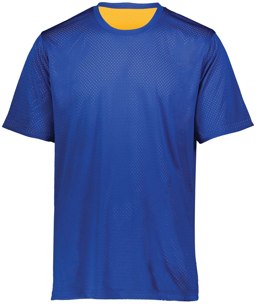 * Two layers of 100% polyester sports mesh body with color secure(r) technology that helps prevent dye migration * 100% polyester wicking smooth knit collar with color secure(r) technology that helps prevent dye migration * Wicks moisture * Tear away label * Crew neck * Fully reversible for wearing on either side * Set-in sleeves * Each layer hemmed separately for embellishment